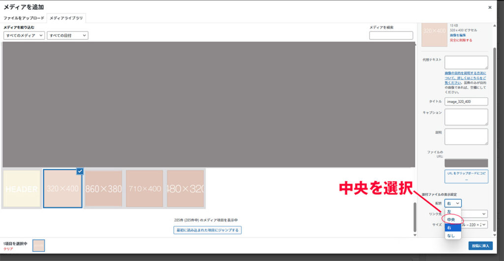 そのまま挿入してしまいますと文字の右に回り込む形で挿入されてしまいますので、必ず「中央」を選択してください。