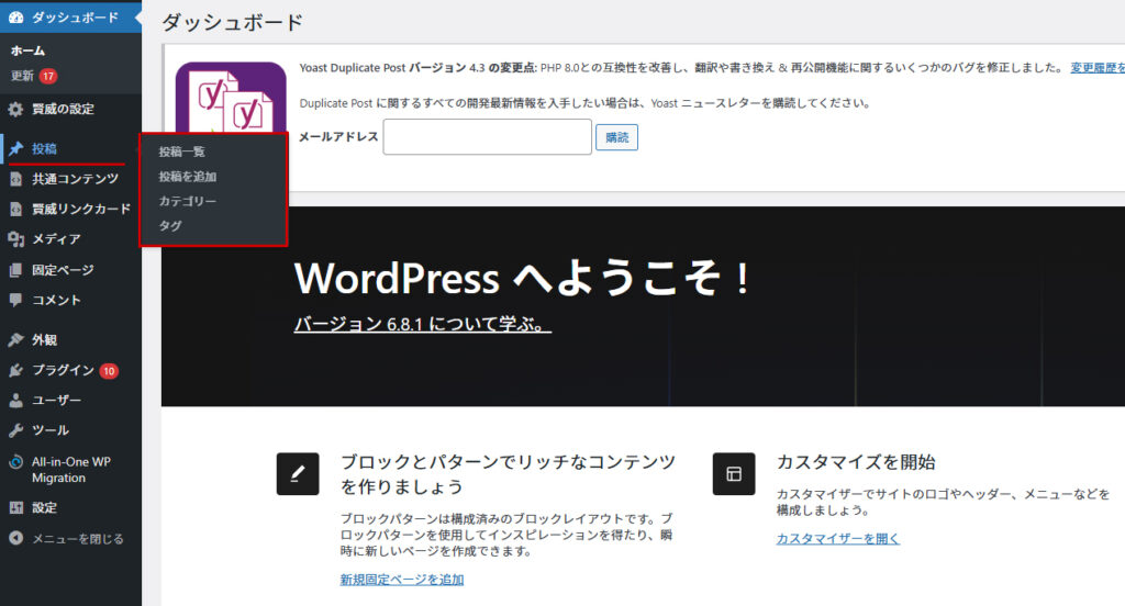 ②画面左にある管理メニューから「投稿」-「投稿を追加」を選択します。