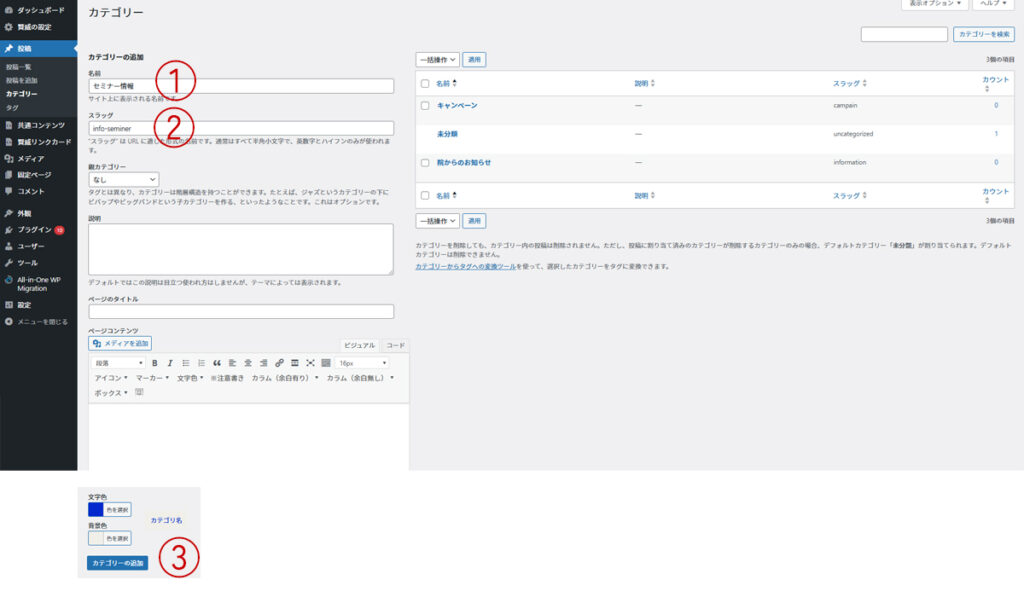 ④のカテゴリーの部分で新しいカテゴリーを設定することも可能です。