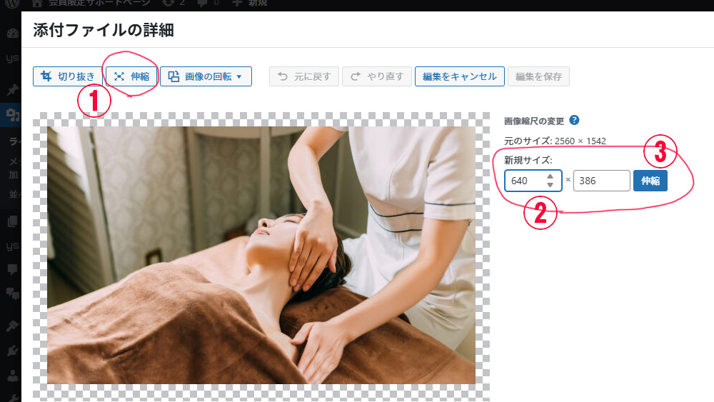 画像サイズが大きい場合は「伸縮」機能を使って新規サイズの左側の数値だけ変更してください。