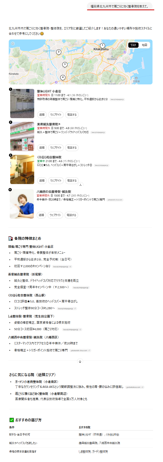 従来のGoogle検索と違い、AIは信頼できる情報を元に「おすすめの整骨院」などを提示します。